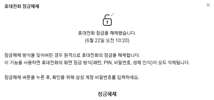 이 방법으로 잠금해제를 하게 되면 기존 설정해두었던 패턴, PIN, 비밀번호, 지문, 얼굴 등이 모두 삭제되고, 잠금 해제 후 재설정해주셔야 합니다.